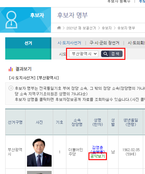 부산광역시로 선택 후 조회!