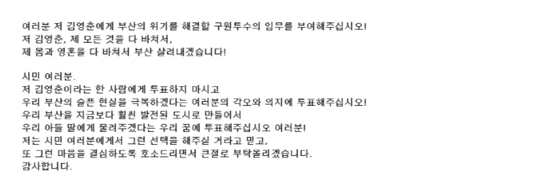 “청와대 수석들이나 대통령께도 바로 직보할 수 있는 김영춘이 위기의 부산을 살릴 수 있는 적임자가 아니겠습니까. 부산의 위기를 해결할 구원투수의 임무를 부여해 주십시오.”